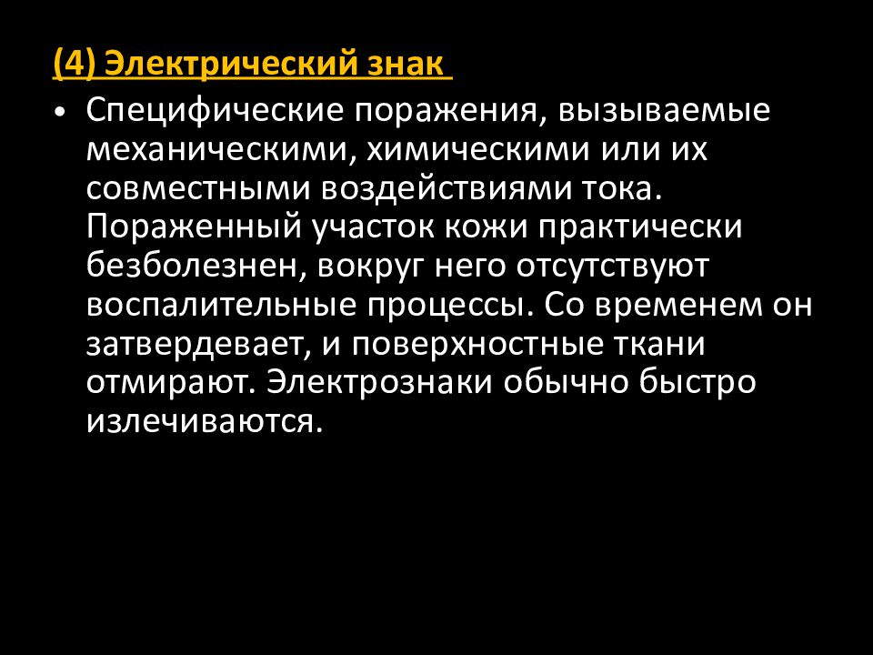 (4) Электрический знак Специфические поражения, вызываемые механическими, химическими или их совместными воздействиями тока. Пораженный участок кожи практически безболезнен, вокруг него отсутствуют воспалительные процессы. Со временем он затвердевает, и поверхностные ткани отмирают. Электрознаки обычно быстро излечиваются.