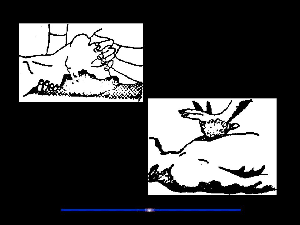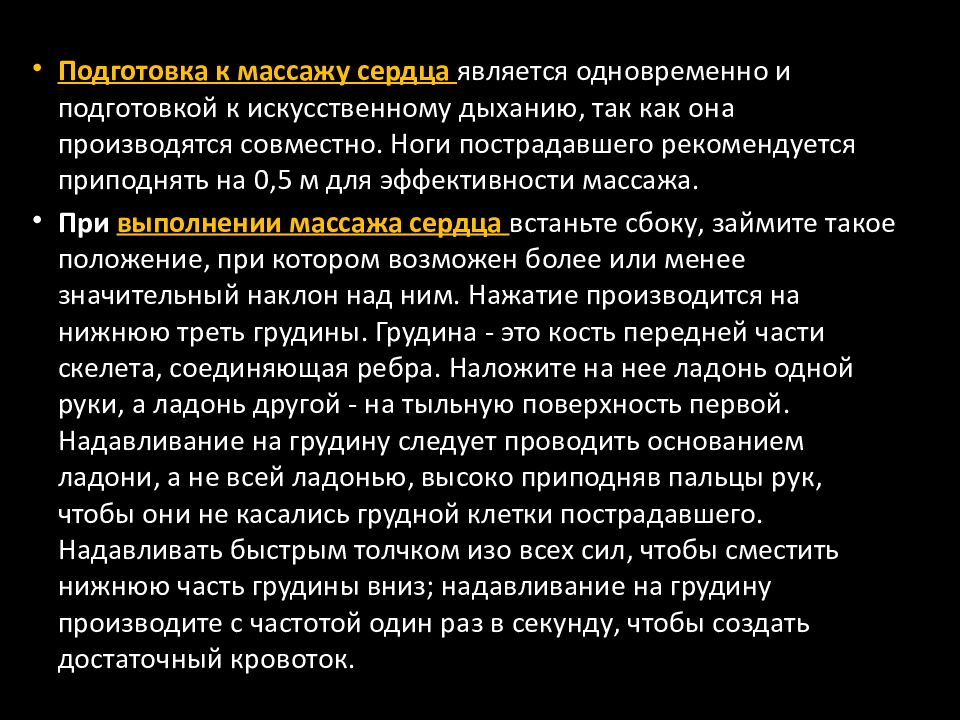 Подготовка к массажу сердца является одновременно и подготовкой к искусственному дыханию, так как она производятся совместно. Ноги пострадавшего рекомендуется приподнять на 0,5 м для эффективности массажа. При выполнении массажа сердца встаньте сбоку, займите такое положение, при котором возможен более или менее значительный наклон над ним. Нажатие производится на нижнюю треть грудины. Грудина - это кость передней части скелета, соединяющая ребра. Наложите на нее ладонь одной руки, а ладонь другой - на тыльную поверхность первой. Надавливание на грудину следует проводить основанием ладони, а не всей ладонью, высоко приподняв пальцы рук, чтобы они не касались грудной клетки пострадавшего. Надавливать быстрым толчком изо всех сил, чтобы сместить нижнюю часть грудины вниз; надавливание на грудину производите с частотой один раз в секунду, чтобы создать достаточный кровоток.