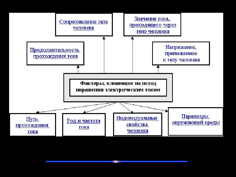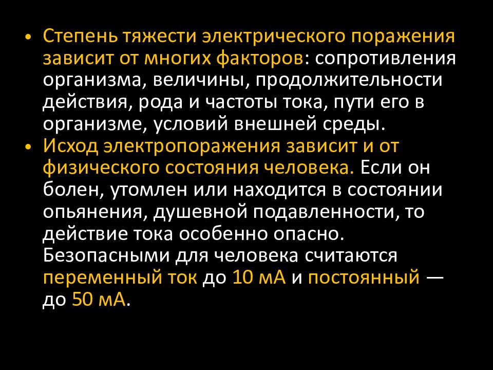 Степень тяжести электрического поражения зависит от многих факторов : сопротивления организма, величины, продолжительности действия, рода и частоты тока, пути его в организме, условий внешней среды. Исход электропоражения зависит и от физического состояния человека. Если он болен, утомлен или находится в состоянии опьянения, душевной подавленности, то действие тока особенно опасно. Безопасными для человека считаются переменный ток до 10 мА и постоянный — до 50 мА.