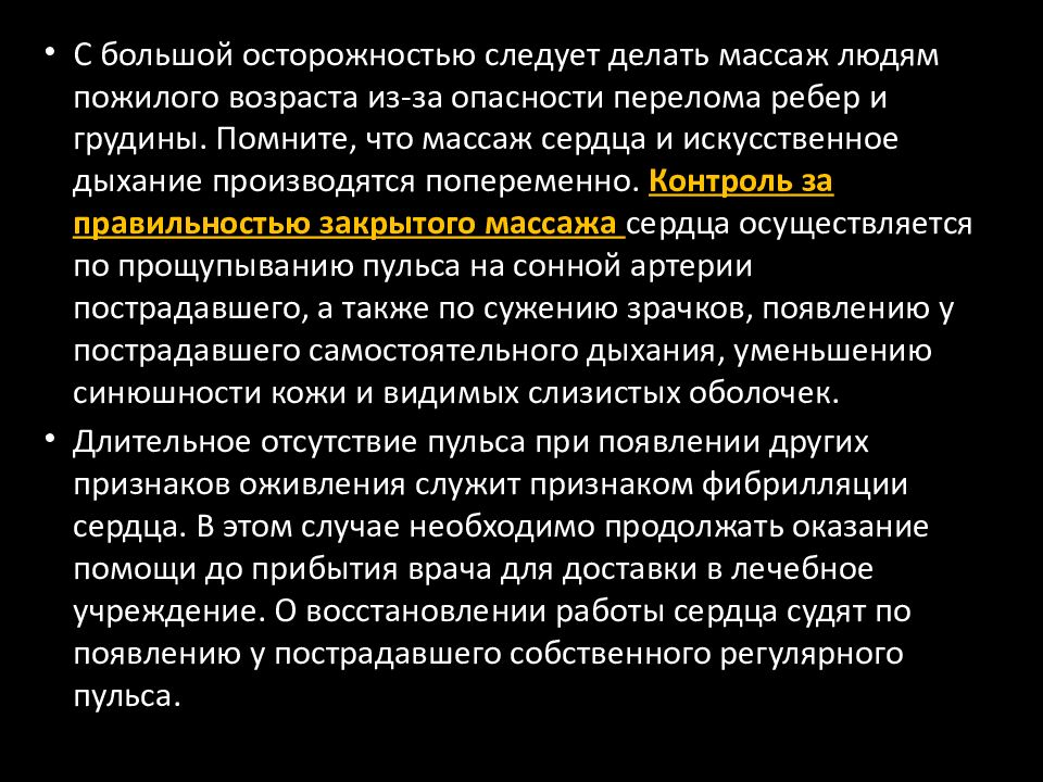 С большой осторожностью следует делать массаж людям пожилого возраста из-за опасности перелома ребер и грудины. Помните, что массаж сердца и искусственное дыхание производятся попеременно. Контроль за правильностью закрытого массажа сердца осуществляется по прощупыванию пульса на сонной артерии пострадавшего, а также по сужению зрачков, появлению у пострадавшего самостоятельного дыхания, уменьшению синюшности кожи и видимых слизистых оболочек. Длительное отсутствие пульса при появлении других признаков оживления служит признаком фибрилляции сердца. В этом случае необходимо продолжать оказание помощи до прибытия врача для доставки в лечебное учреждение. О восстановлении работы сердца судят по появлению у пострадавшего собственного регулярного пульса.