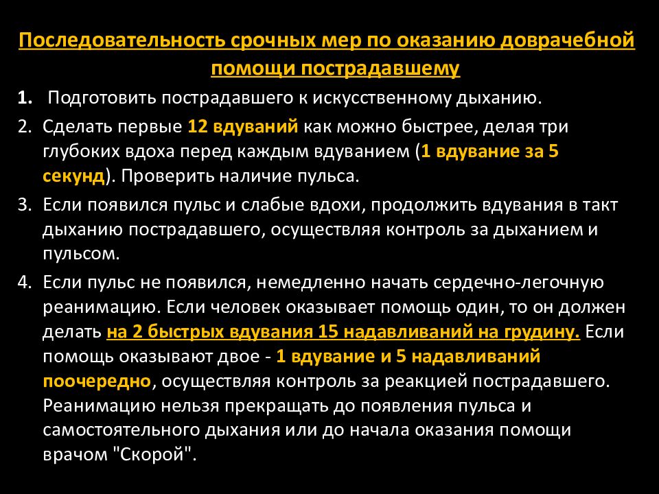 Последовательность срочных мер по оказанию доврачебной помощи пострадавшему Подготовить пострадавшего к искусственному дыханию. Сделать первые 12 вдуваний как можно быстрее, делая три глубоких вдоха перед каждым вдуванием ( 1 вдувание за 5 секунд ). Проверить наличие пульса. Если появился пульс и слабые вдохи, продолжить вдувания в такт дыханию пострадавшего, осуществляя контроль за дыханием и пульсом. Если пульс не появился, немедленно начать сердечно-легочную реанимацию. Если человек оказывает помощь один, то он должен делать на 2 быстрых вдувания 15 надавливаний на грудину. Если помощь оказывают двое - 1 вдувание и 5 надавливаний поочередно, осуществляя контроль за реакцией пострадавшего. Реанимацию нельзя прекращать до появления пульса и самостоятельного дыхания или до начала оказания помощи врачом "Скорой".