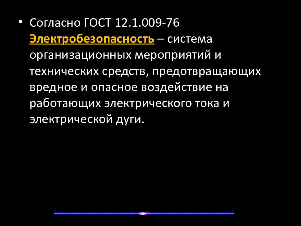 Согласно ГОСТ 12.1.009-76 Электробезопасность – система организационных мероприятий и технических средств, предотвращающих вредное и опасное воздействие на работающих электрического тока и электрической дуги.