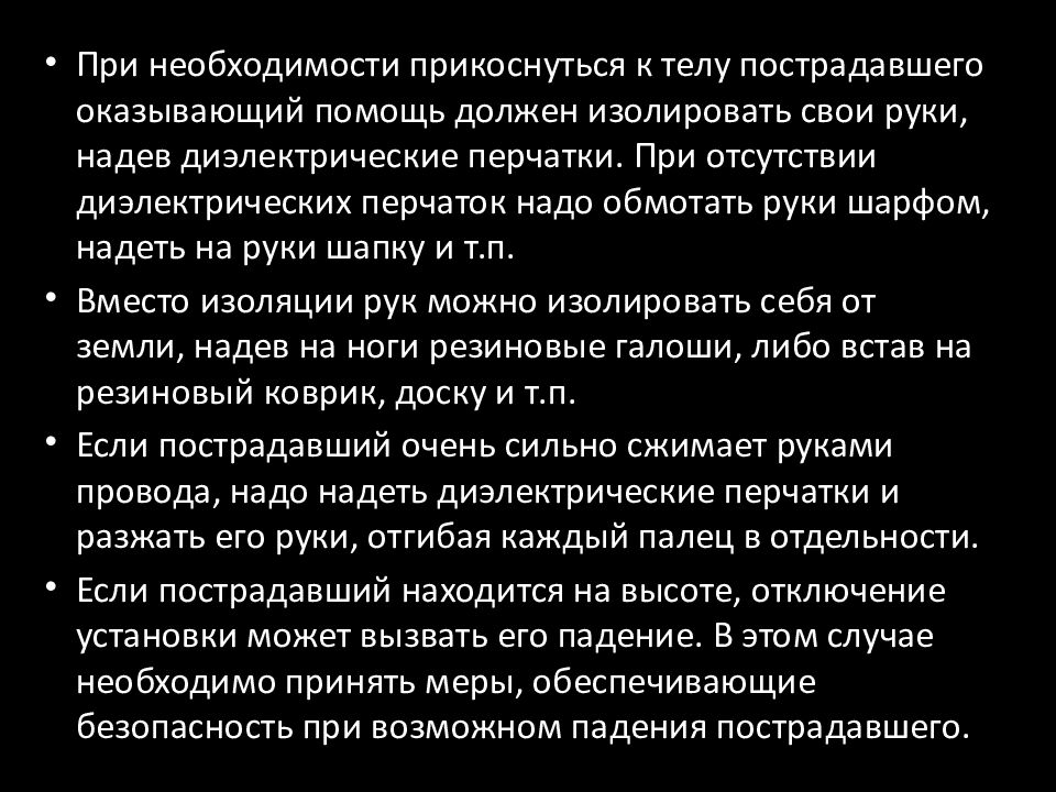 При необходимости прикоснуться к телу пострадавшего оказывающий помощь должен изолировать свои руки, надев диэлектрические перчатки. При отсутствии диэлектрических перчаток надо обмотать руки шарфом, надеть на руки шапку и т.п. Вместо изоляции рук можно изолировать себя от земли, надев на ноги резиновые галоши, либо встав на резиновый коврик, доску и т.п. Если пострадавший очень сильно сжимает руками провода, надо надеть диэлектрические перчатки и разжать его руки, отгибая каждый палец в отдельности. Если пострадавший находится на высоте, отключение установки может вызвать его падение. В этом случае необходимо принять меры, обеспечивающие безопасность при возможном падения пострадавшего.