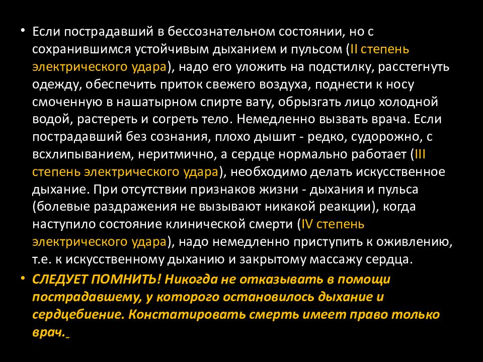 Если пострадавший в бессознательном состоянии, но с сохранившимся устойчивым дыханием и пульсом ( II степень электрического удара ), надо его уложить на подстилку, расстегнуть одежду, обеспечить приток свежего воздуха, поднести к носу смоченную в нашатырном спирте вату, обрызгать лицо холодной водой, растереть и согреть тело. Немедленно вызвать врача. Если пострадавший без сознания, плохо дышит - редко, судорожно, с всхлипыванием, неритмично, а сердце нормально работает ( III степень электрического удара ), необходимо делать искусственное дыхание. При отсутствии признаков жизни - дыхания и пульса (болевые раздражения не вызывают никакой реакции), когда наступило состояние клинической смерти ( IV степень электрического удара ), надо немедленно приступить к оживлению, т.е. к искусственному дыханию и закрытому массажу сердца. СЛЕДУЕТ ПОМНИТЬ! Никогда не отказывать в помощи пострадавшему, у которого остановилось дыхание и сердцебиение. Констатировать смерть имеет право только врач.