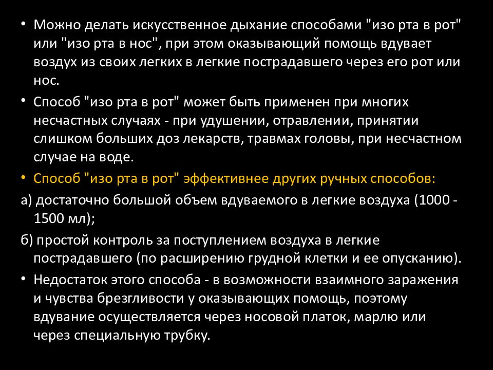 Можно делать искусственное дыхание способами "изо рта в рот" или "изо рта в нос", при этом оказывающий помощь вдувает воздух из своих легких в легкие пострадавшего через его рот или нос. Способ "изо рта в рот" может быть применен при многих несчастных случаях - при удушении, отравлении, принятии слишком больших доз лекарств, травмах головы, при несчастном случае нa воде. Способ "изо рта в рот" эффективнее других ручных способов: а) достаточно большой объем вдуваемого в легкие воздуха (1000 - 1500 мл); б) простой контроль за поступлением воздуха в легкие пострадавшего (по расширению грудной клетки и ее опусканию). Недостаток этого способа - в возможности взаимного заражения и чувства брезгливости у оказывающих помощь, поэтому вдувание осуществляется через носовой платок, марлю или через специальную трубку.