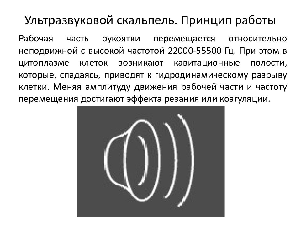Рабочая часть рукоятки перемещается относительно неподвижной с высокой частотой 22000-55500 Гц. При этом в цитоплазме клеток возникают кавитационные полости, которые, спадаясь, приводят к гидродинамическому разрыву клетки. Меняя амплитуду движения рабочей части и частоту перемещения достигают эффекта резания или коагуляции.