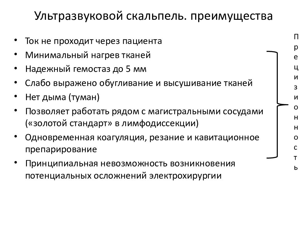 Ток не проходит через пациента Минимальный нагрев тканей Надежный гемостаз до 5 мм Слабо выражено обугливание и высушивание тканей Нет дыма (туман) Позволяет работать рядом с магистральными сосудами («золотой стандарт» в лимфодиссекции ) Одновременная коагуляция, резание и кавитационное препарирование Принципиальная невозможность возникновения потенциальных осложнений электрохирургии П р е ц и з и о н н о с т ь