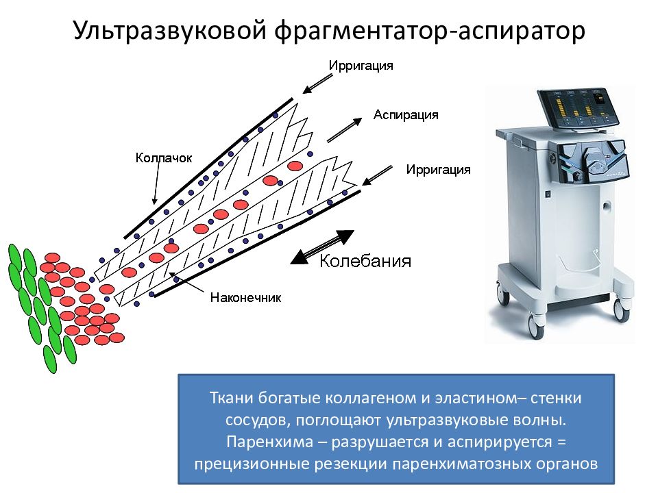 Ткани богатые коллагеном и эластином– стенки сосудов, поглощают ультразвуковые волны. Паренхима – разрушается и аспирируется = прецизионные резекции паренхиматозных органов