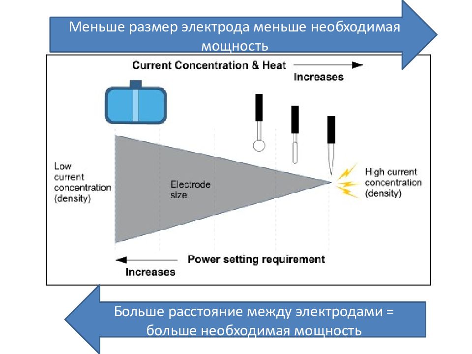 Больше расстояние между электродами = больше необходимая мощность Меньше размер электрода меньше необходимая мощность