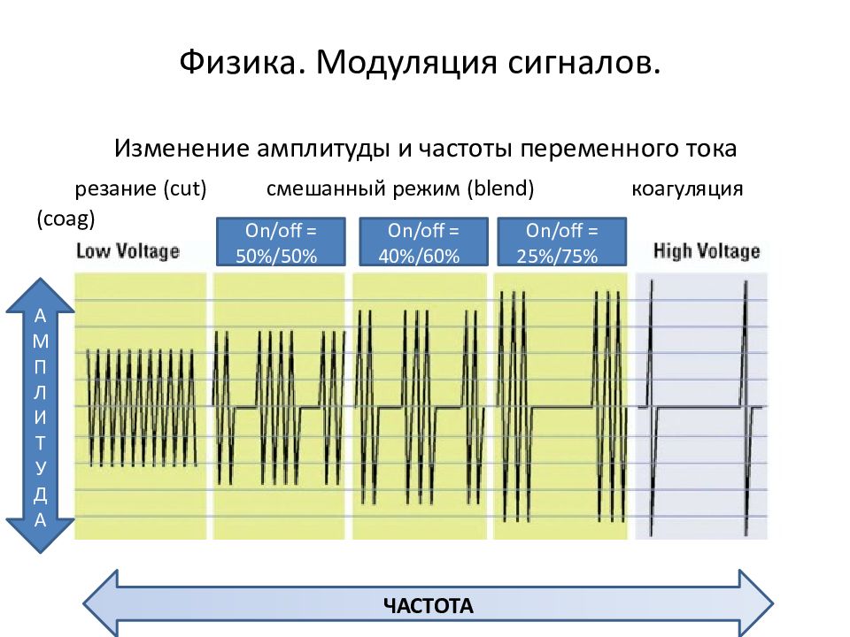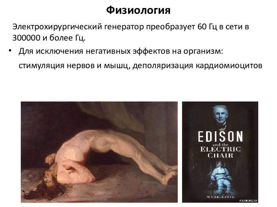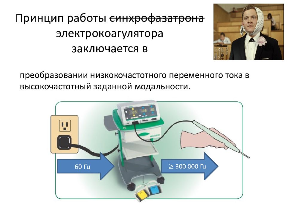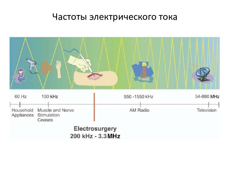 Электрохирургический генератор п реобразует 60 Гц в сети в 300000 и более Гц. Для исключения негативных эффектов на организм: стимуляция нервов и мышц, деполяризация кардиомиоцитов