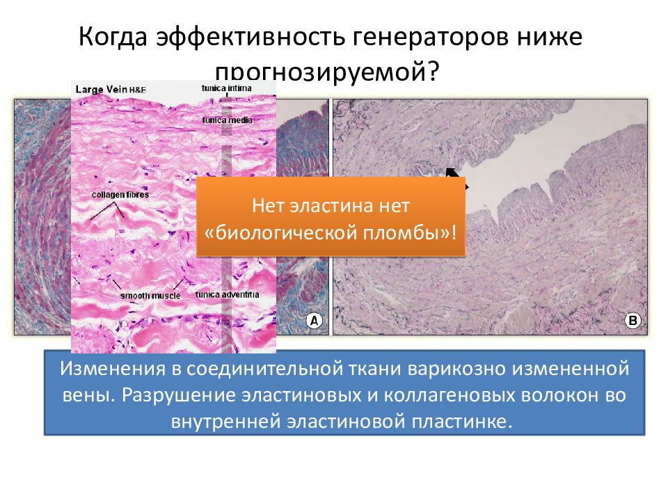 Изменения в соединительной ткани варикозно измененной вены. Разрушение эластиновых и коллагеновых волокон во внутренней эластиновой пластинке. Нет эластина нет «биологической пломбы»!