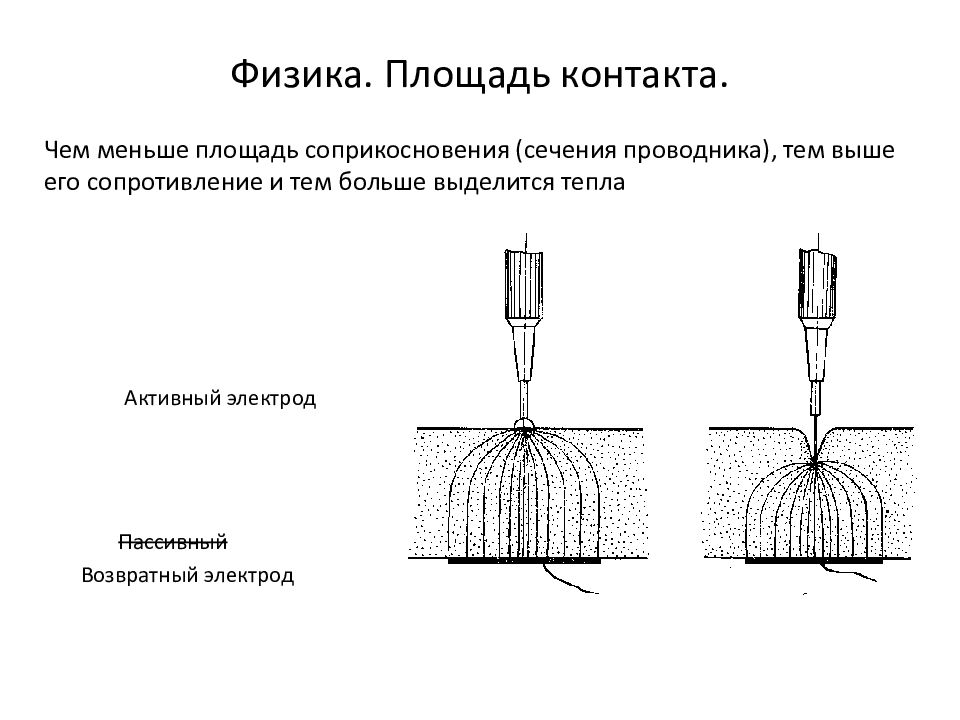 Чем меньше площадь соприкосновения (сечения проводника), тем выше его сопротивление и тем больше выделится тепла Активный электрод Пассивный Возвратный электрод