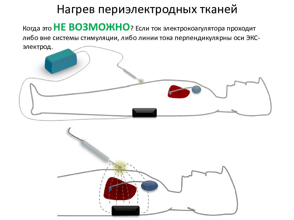 Когда это НЕ ВОЗМОЖНО ? Если ток электрокоагулятора проходит либо вне системы стимуляции, либо линии тока перпендикулярны оси ЭКС-электрод.