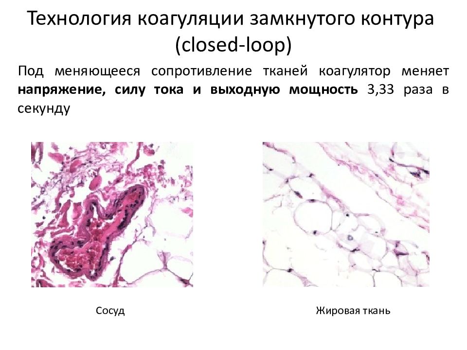 Под меняющееся сопротивление тканей коагулятор меняет напряжение, силу тока и выходную мощность 3,33 раза в секунду Сосуд Жировая ткань