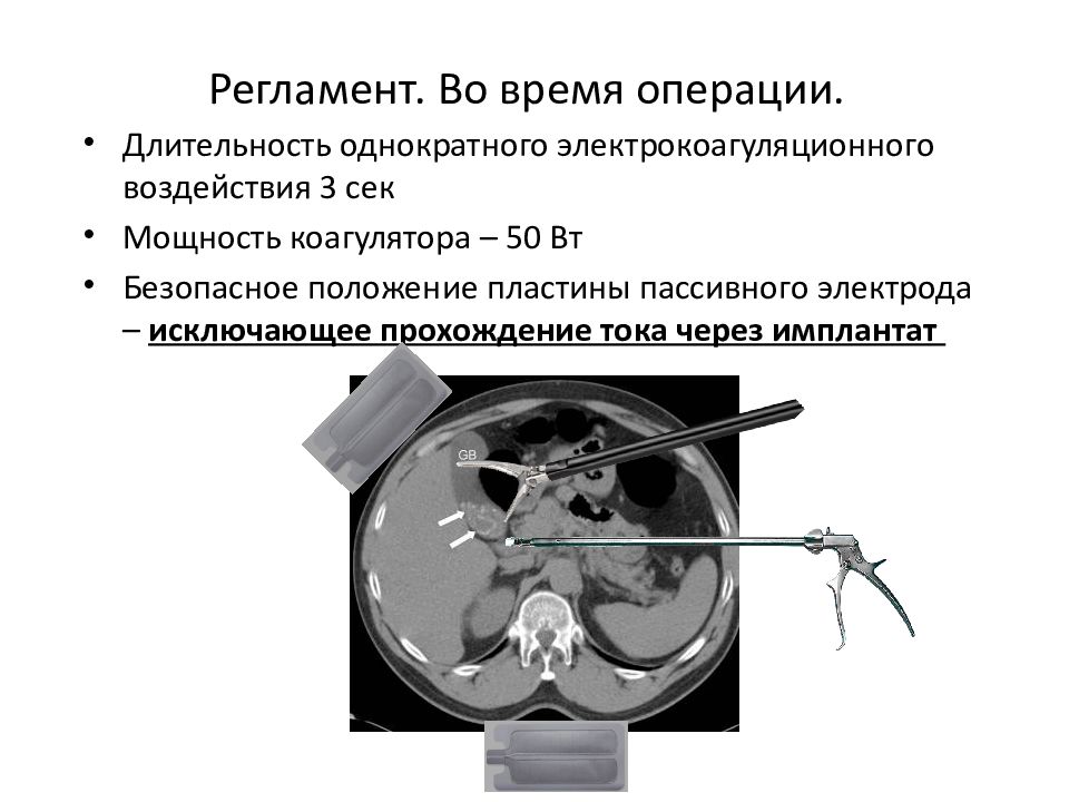Длительность однократного электрокоагуляционного воздействия 3 сек Мощность коагулятора – 50 Вт Безопасное положение пластины пассивного электрода – исключающее прохождение тока через имплантат