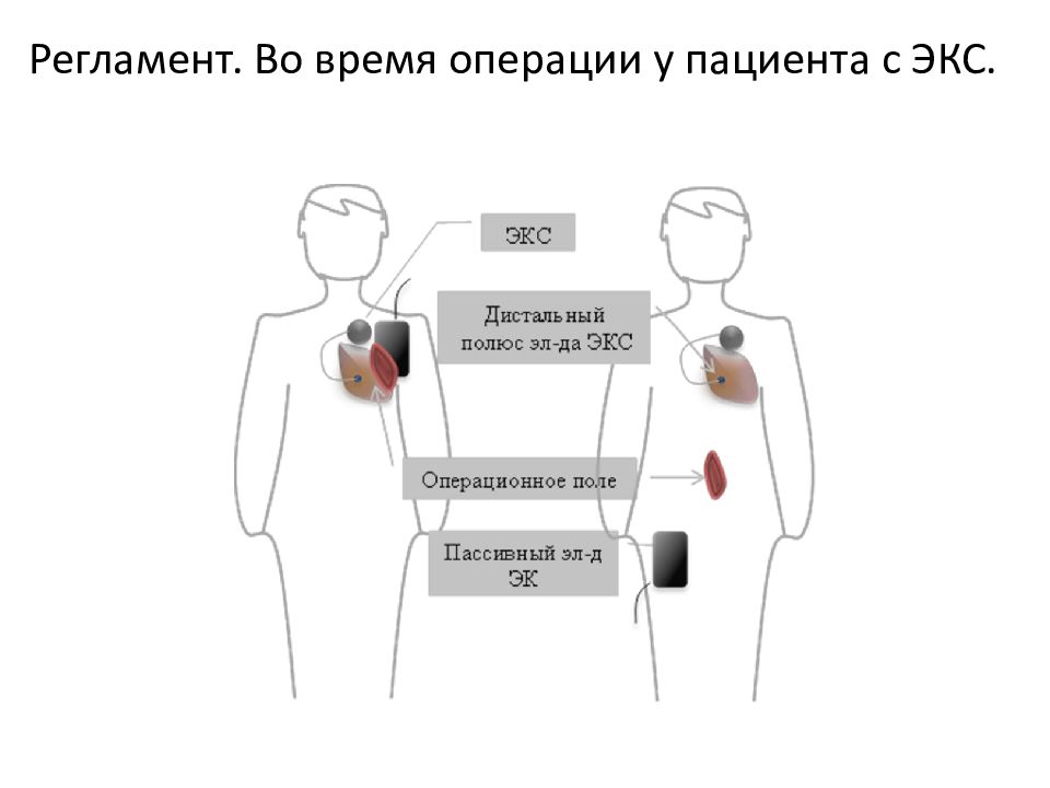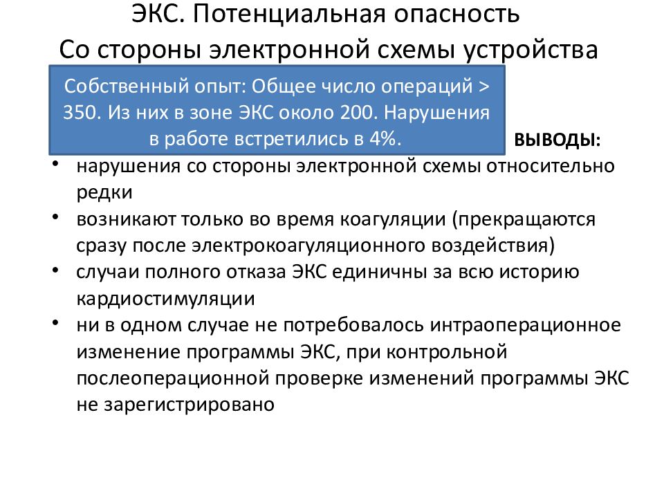 ВЫВОДЫ: нарушения со стороны электронной схемы относительно редки в озникают только во время коагуляции (прекращаются сразу после электрокоагуляционного воздействия) с лучаи полного отказа ЭКС единичны за всю историю кардиостимуляции ни в одном случае не потребовалось интраоперационное изменение программы ЭКС, при контрольной послеоперационной проверке изменений программы ЭКС не зарегистрировано Собственный опыт: Общее число операций > 350. Из них в зоне ЭКС около 200. Нарушения в работе встретились в 4%.