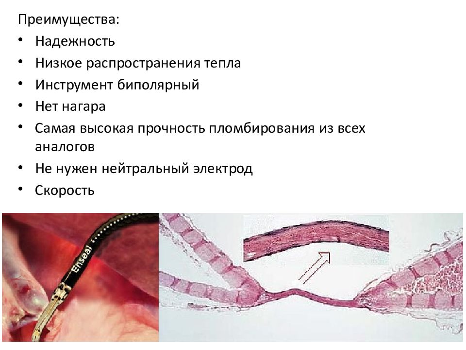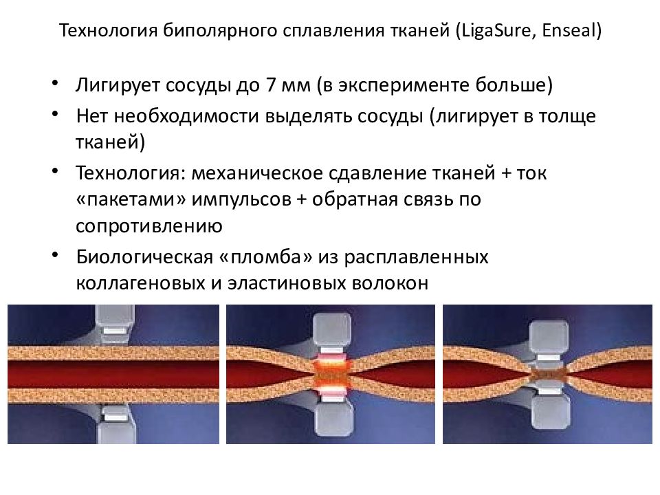 Лигирует сосуды до 7 мм (в эксперименте больше) Нет необходимости выделять сосуды ( лигирует в толще тканей) Технология: механическое сдавление тканей + ток «пакетами» импульсов + обратная связь по сопротивлению Биологическая «пломба» из расплавленных коллагеновых и эластиновых волокон