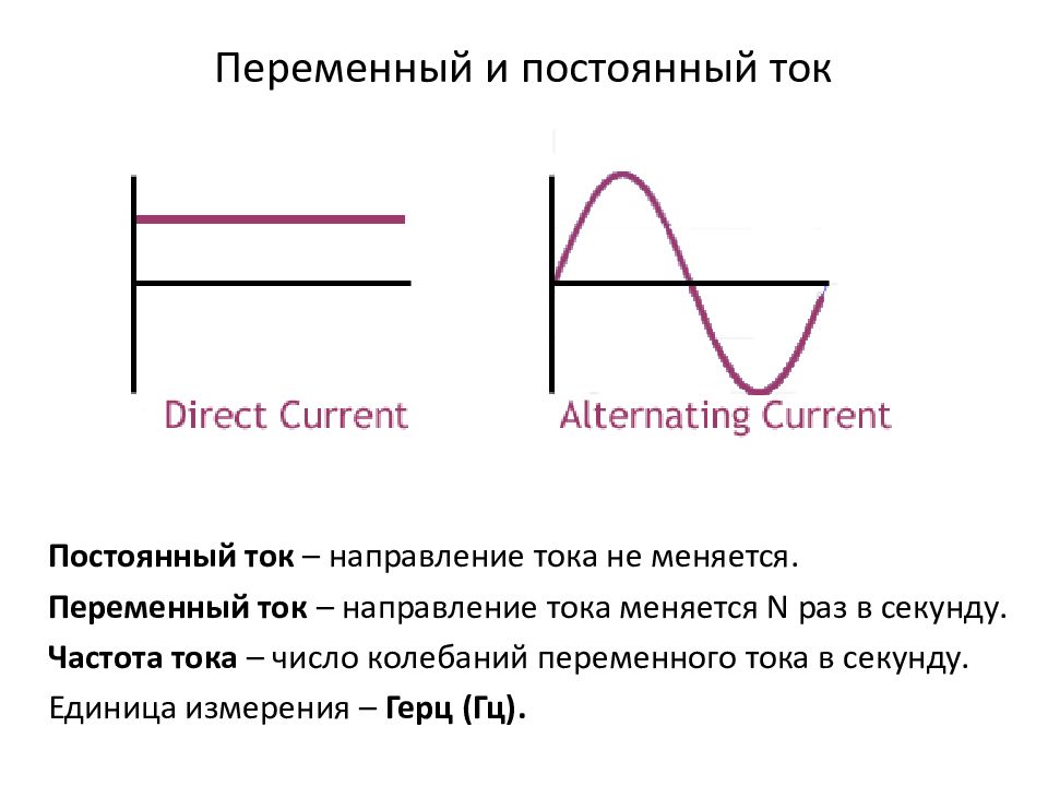 Постоянный ток – направление тока не меняется. Переменный ток – направление тока меняется N раз в секунду. Частота тока – число колебаний переменного тока в секунду. Единица измерения – Герц (Гц).
