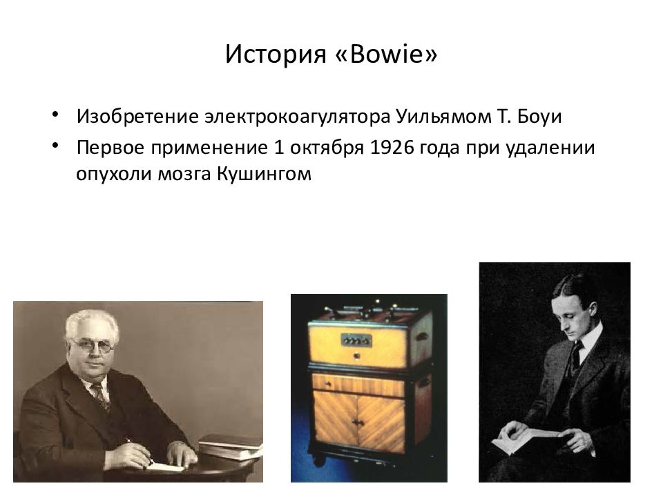 Изобретение электрокоагулятора Уильямом Т. Боуи Первое применение 1 октября 1926 года при удалении опухоли мозга Кушингом