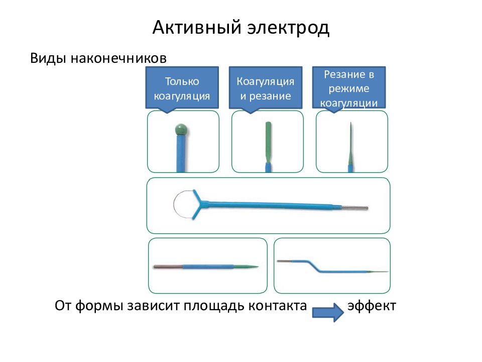 Виды наконечников От формы зависит площадь контакта эффект Только коагуляция Коагуляция и резание Резание в режиме коагуляции