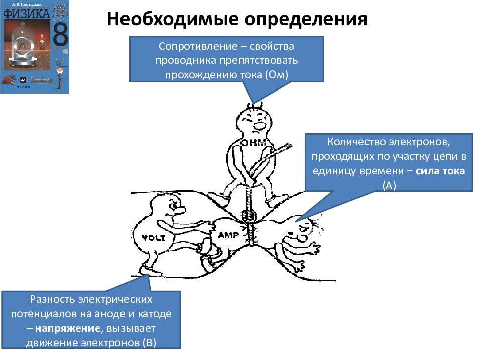 Количество электронов, проходящих по участку цепи в единицу времени – сила тока (А) Разность электрических потенциалов на аноде и катоде – напряжение, вызывает движение электронов (В) Сопротивление – свойства проводника препятствовать прохождению тока (Ом)