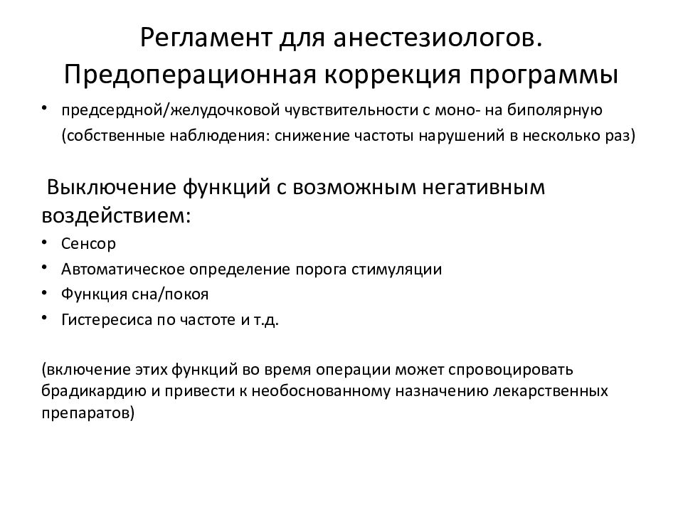 Слайд 84: Регламент для анестезиологов. Предоперационная коррекция программы
