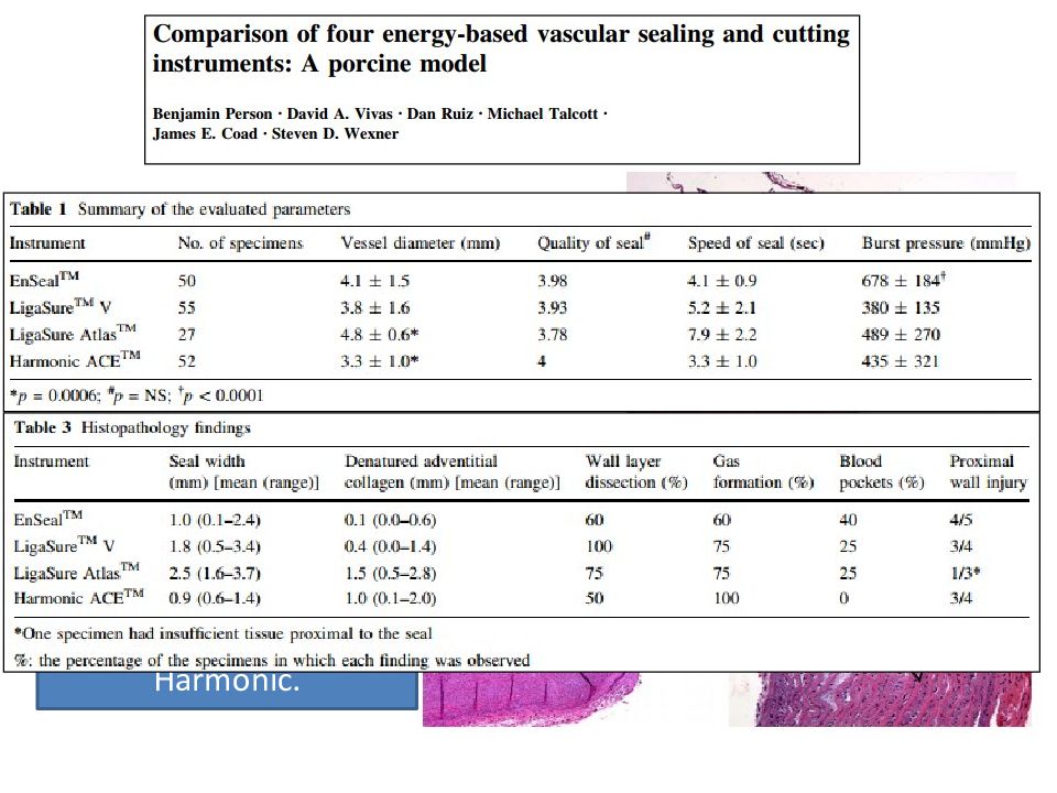 Денатурированные коллагеновые волокна. Отслока интимы и адвентиции. LigaSure Формирование пузырьков газа в стенке сосуда. Harmonic.