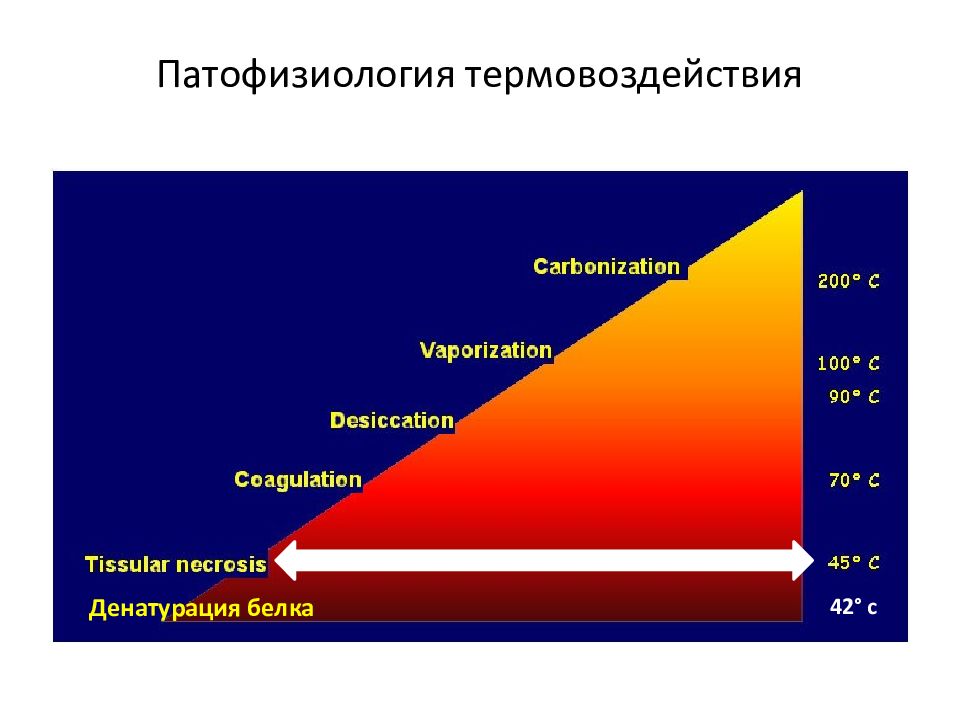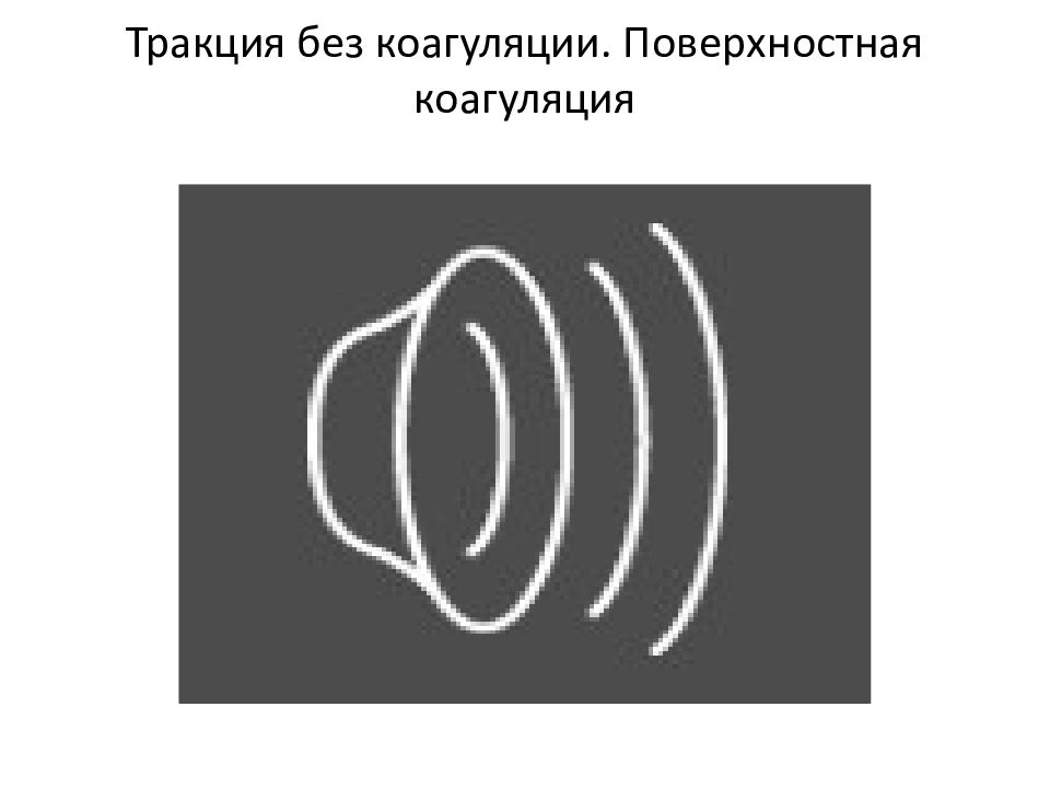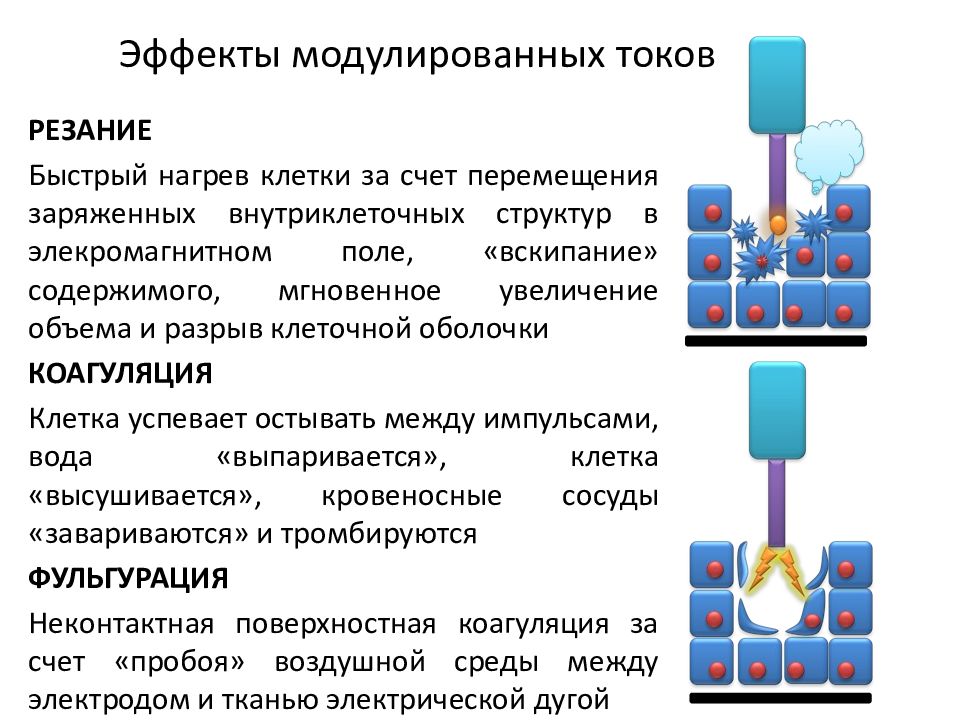 РЕЗАНИЕ Быстрый нагрев клетки за счет перемещения заряженных внутриклеточных структур в элекромагнитном поле, «вскипание» содержимого, мгновенное увеличение объема и разрыв клеточной оболочки КОАГУЛЯЦИЯ Клетка успевает остывать между импульсами, вода «выпаривается», клетка «высушивается», кровеносные сосуды «завариваются» и тромбируются ФУЛЬГУРАЦИЯ Неконтактная поверхностная коагуляция за счет «пробоя» воздушной среды между электродом и тканью электрической дугой
