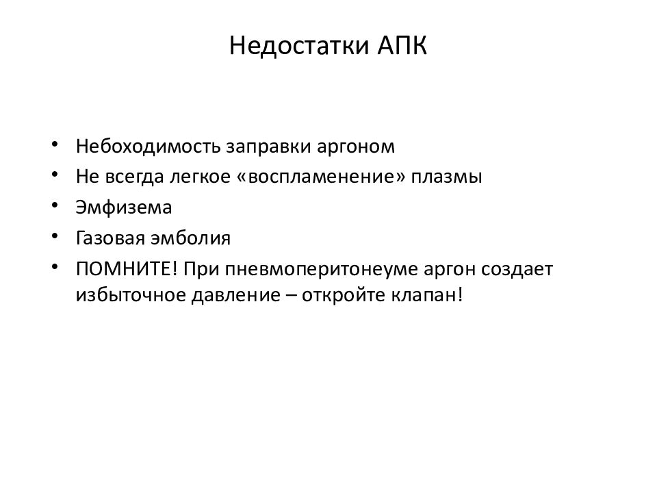 Небоходимость заправки аргоном Не всегда легкое «воспламенение» плазмы Эмфизема Газовая эмболия ПОМНИТЕ! При пневмоперитонеуме аргон создает избыточное давление – откройте клапан!