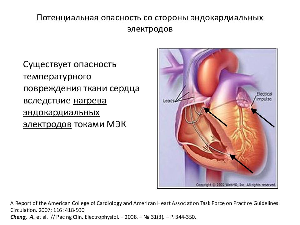 Существует опасность температурного повреждения ткани сердца вследствие нагрева эндокардиальных электродов токами МЭК A Report of the American College of Cardiology and American Heart Association Task Force on Practice Guidelines. Circulation. 2007; 116: 418-500 Cheng, A. et al. // Pacing Clin. Electrophysiol. – 2008. – № 31(3). – Р. 344-350.