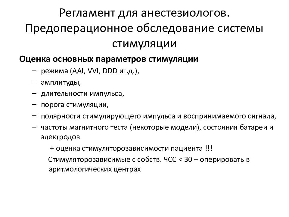 Слайд 83: Регламент для анестезиологов. Предоперационное обследование системы стимуляции