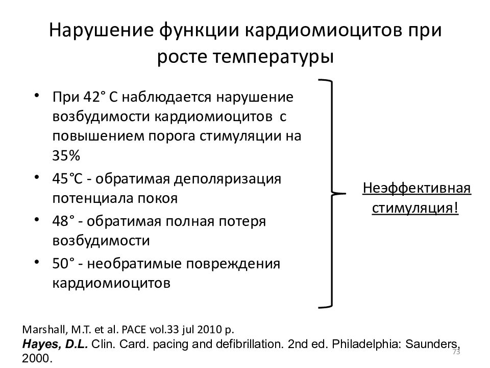 При 42° С наблюдается нарушение возбудимости кардиомиоцитов с повышением порога стимуляции на 35% 45°С - обратимая деполяризация потенциала покоя 48° - обратимая полная потеря возбудимости 50° - необратимые повреждения кардиомиоцитов Неэффективная стимуляция! 73 Marshall, M. T. et al. PACE vol.33 jul 2010 p. Hayes, D.L. Clin. Card. pacing and defibrillation. 2nd ed. Philadelphia: Saunders, 2000.