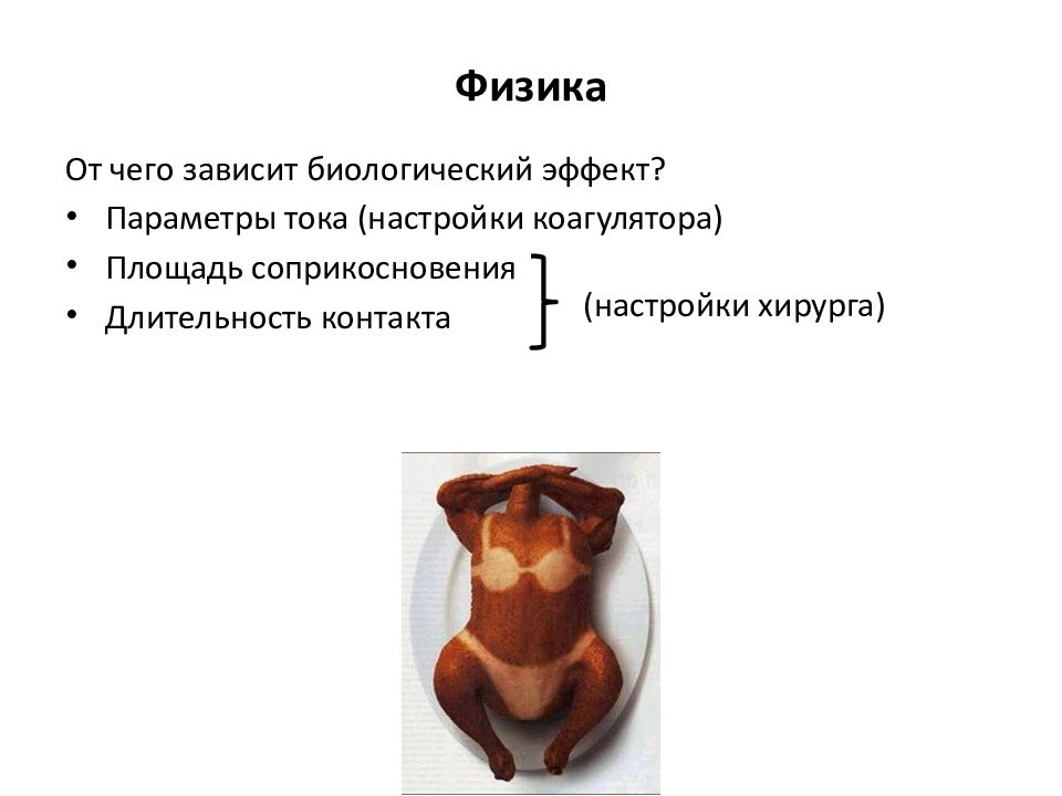 От чего зависит биологический эффект? Параметры тока (настройки коагулятора) Площадь соприкосновения Длительность контакта (настройки хирурга)