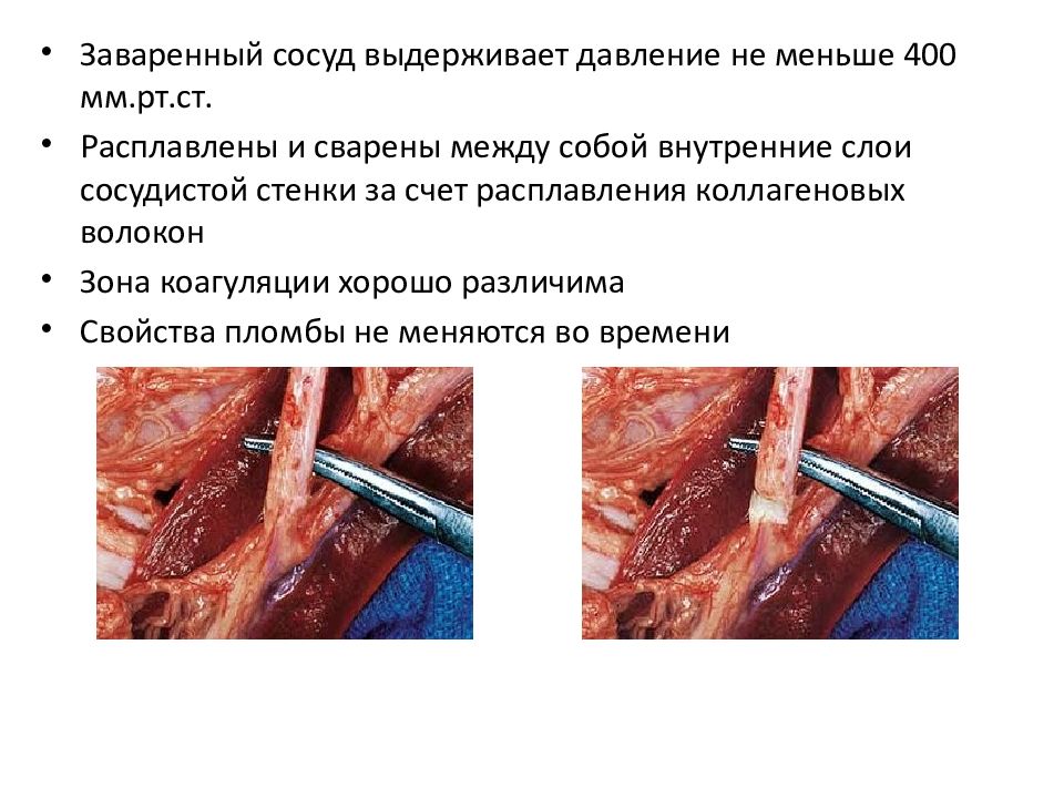Заваренный сосуд выдерживает давление не меньше 400 мм.рт.ст. Расплавлены и сварены между собой внутренние слои сосудистой стенки за счет расплавления коллагеновых волокон Зона коагуляции хорошо различима Свойства пломбы не меняются во времени