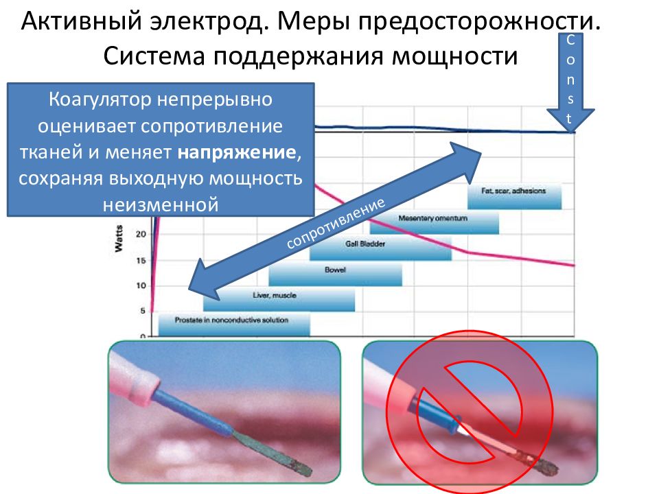СОПРОТИВЛЕНИЕ сопротивление C o n s t Коагулятор непрерывно оценивает сопротивление тканей и меняет напряжение, сохраняя выходную мощность неизменной