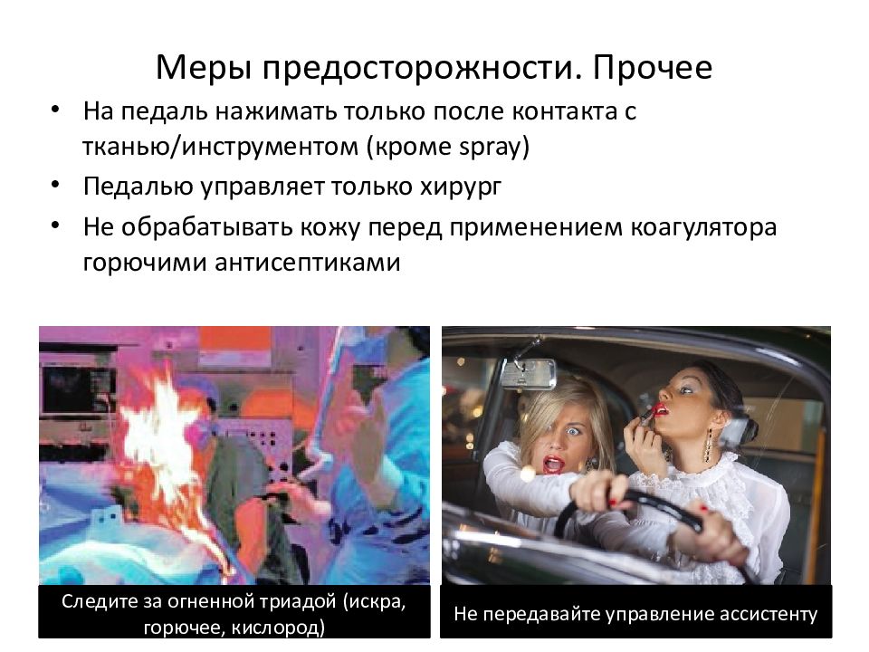 На педаль нажимать только после контакта с тканью/инструментом (кроме spray ) Педалью управляет только хирург Не обрабатывать кожу перед применением коагулятора горючими антисептиками Не передавайте управление ассистенту Следите за огненной триадой (искра, горючее, кислород)
