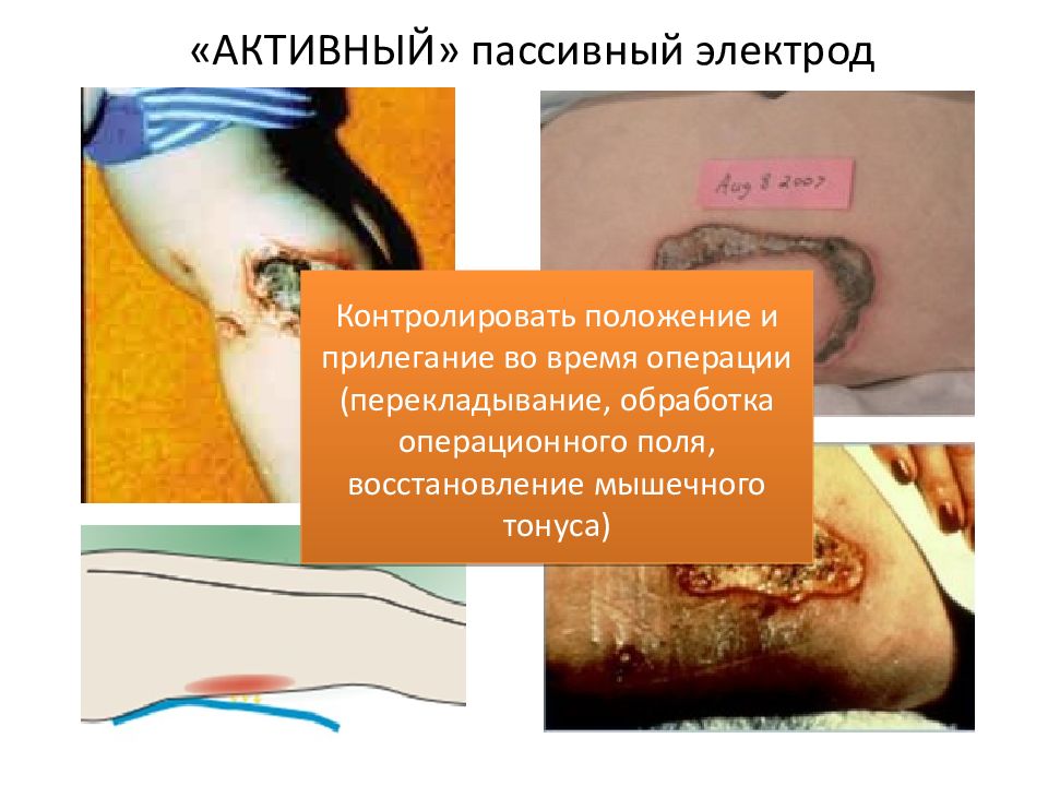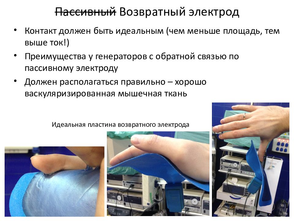 Контакт должен быть идеальным (чем меньше площадь, тем выше ток!) Преимущества у генераторов с обратной связью по пассивному электроду Должен располагаться правильно – хорошо васкуляризированная мышечная ткань Идеальная пластина возвратного электрода