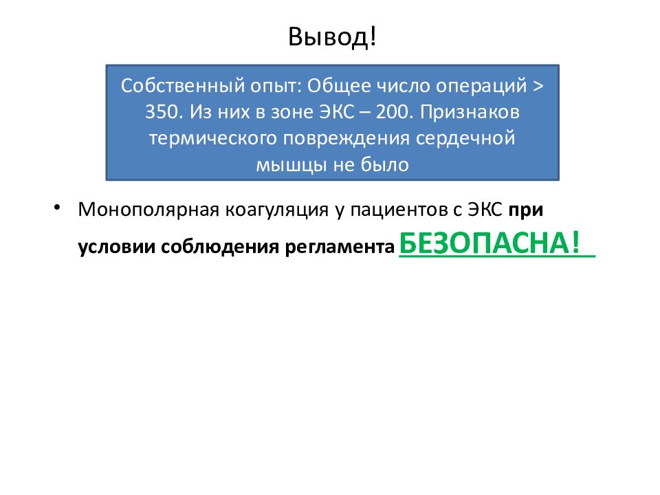 Монополярная коагуляция у пациентов с ЭКС при условии соблюдения регламента БЕЗОПАСНА! Собственный опыт: Общее число операций > 350. Из них в зоне ЭКС – 200. Признаков термического повреждения сердечной мышцы не было