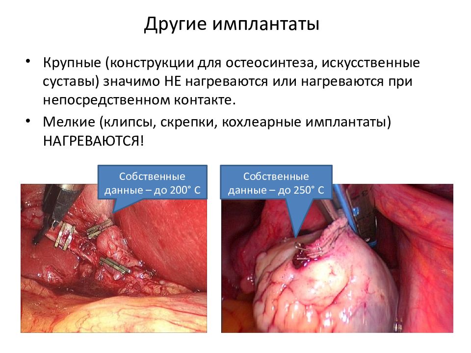 Крупные (конструкции для остеосинтеза, искусственные суставы) значимо НЕ нагреваются или нагреваются при непосредственном контакте. Мелкие (клипсы, скрепки, кохлеарные имплантаты) НАГРЕВАЮТСЯ! Собственные данные – до 200° С Собственные данные – до 250° С