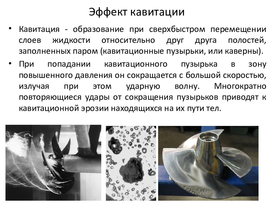 Кавитация - образование при сверхбыстром перемещении слоев жидкости относительно друг друга полостей, заполненных паром ( кавитационные пузырьки, или каверны). При попадании кавитационного пузырька в зону повышенного давления он сокращается с большой скоростью, излучая при этом ударную волну. Многократно повторяющиеся удары от сокращения пузырьков приводят к кавитационной эрозии находящихся на их пути тел.