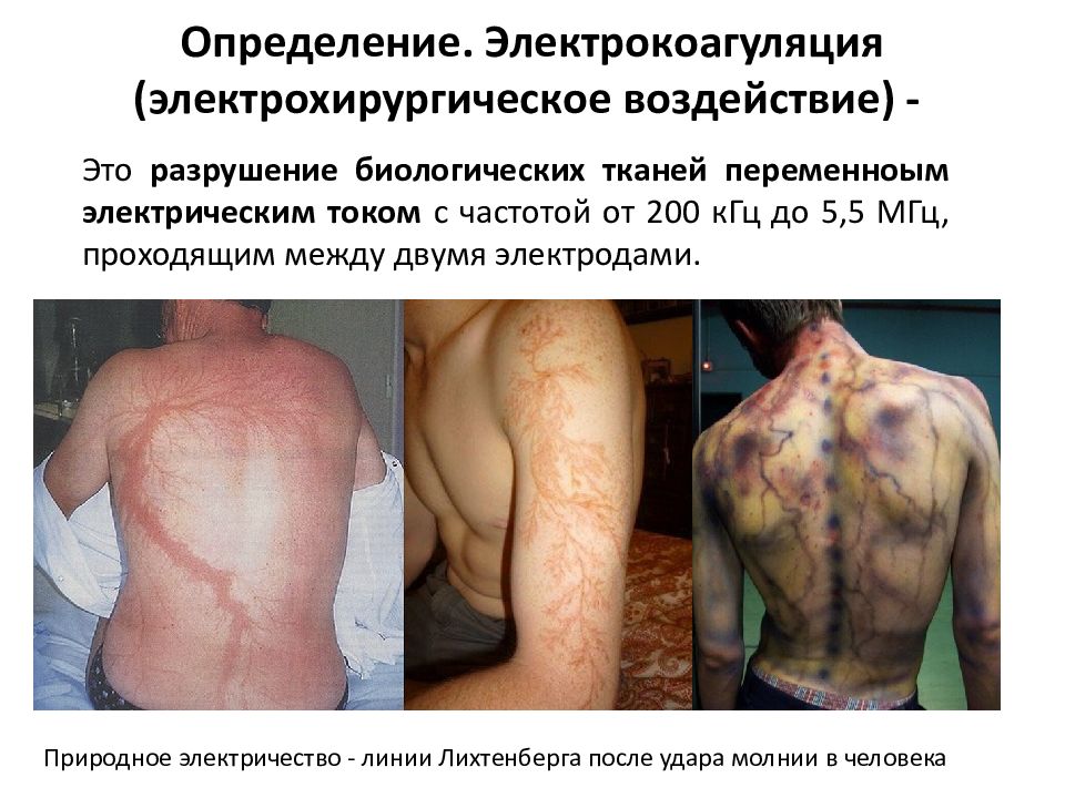 Это разрушение биологических тканей переменноым электрическим током с частотой от 200 кГц до 5,5 МГц, проходящим между двумя электродами. Природное электричество - л инии Лихтенберга после удара молнии в человека
