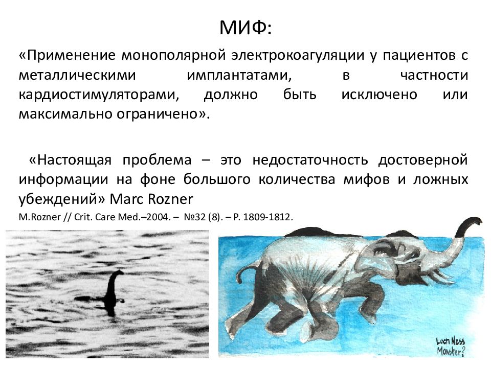 «Применение монополярной электрокоагуляции у пациентов с металлическими имплантатами, в частности кардиостимуляторами, должно быть исключено или максимально ограничено». «Настоящая проблема – это недостаточность достоверной информации на фоне большого количества мифов и ложных убеждений» Marc Rozner M.Rozner // Crit. Care Med.–2004. – №32 (8). – Р. 1809-1812.