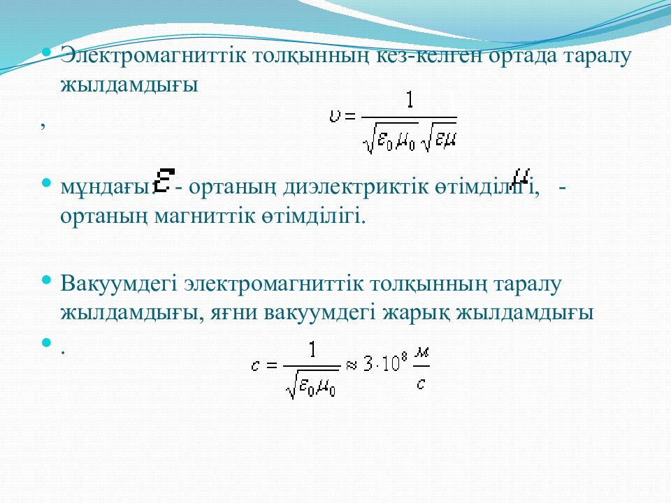 Электромагниттік толқынның кез-келген ортада таралу жылдамдығы , мұндағы: - ортаның диэлектриктік өтімділігі, -ортаның магниттік өтімділігі. Вакуумдегі электромагниттік толқынның таралу жылдамдығы, яғни вакуумдегі жарық жылдамдығы .