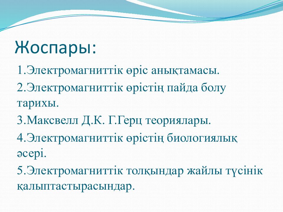 1.Электромагниттік өріс анықтамасы. 2. Электромагниттік өрістің пайда болу тарихы. 3. Максвелл Д.К. Г.Герц теориялары. 4. Электромагниттік өрістің биологиялық әсері. 5.Электромагниттік толқындар жайлы түсінік қалыптастырасындар.