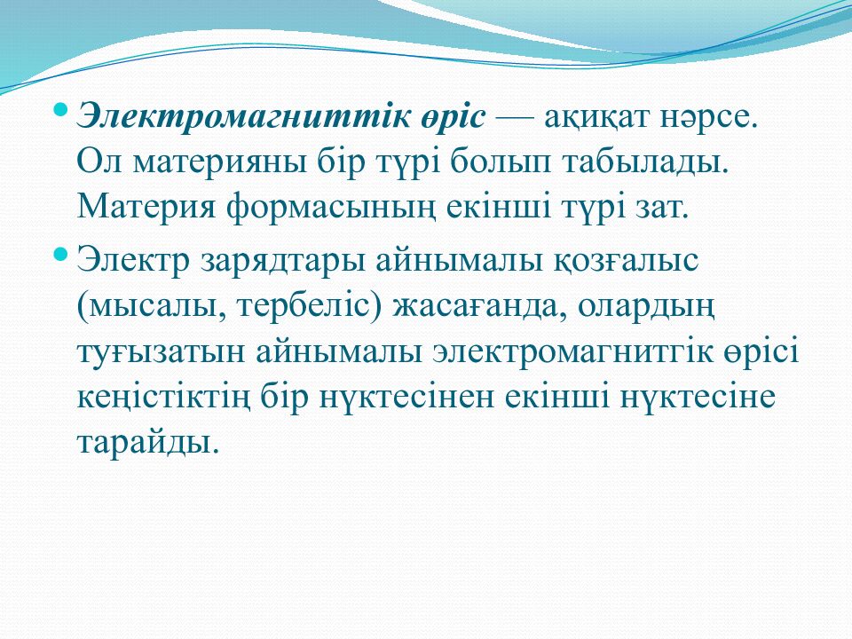 Электромагниттік өріс — ақиқат нәрсе. Ол материяны бір түрі болып табылады. Материя формасының екінші түрі зат. Электр зарядтары айнымалы қозғалыс ( мысалы, тербеліс ) жасағанда, олардың туғызатын айнымалы электромагнитгік өрісі кеңістіктің бір нүктесінен екінші нүктесіне тарайды.