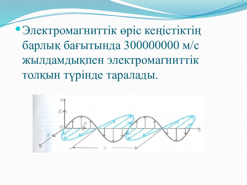 Электромагниттік өріс кеңістіктің барлық бағытында 300000000 м/с жылдамдықпен электромагниттік толқын түрінде таралады.