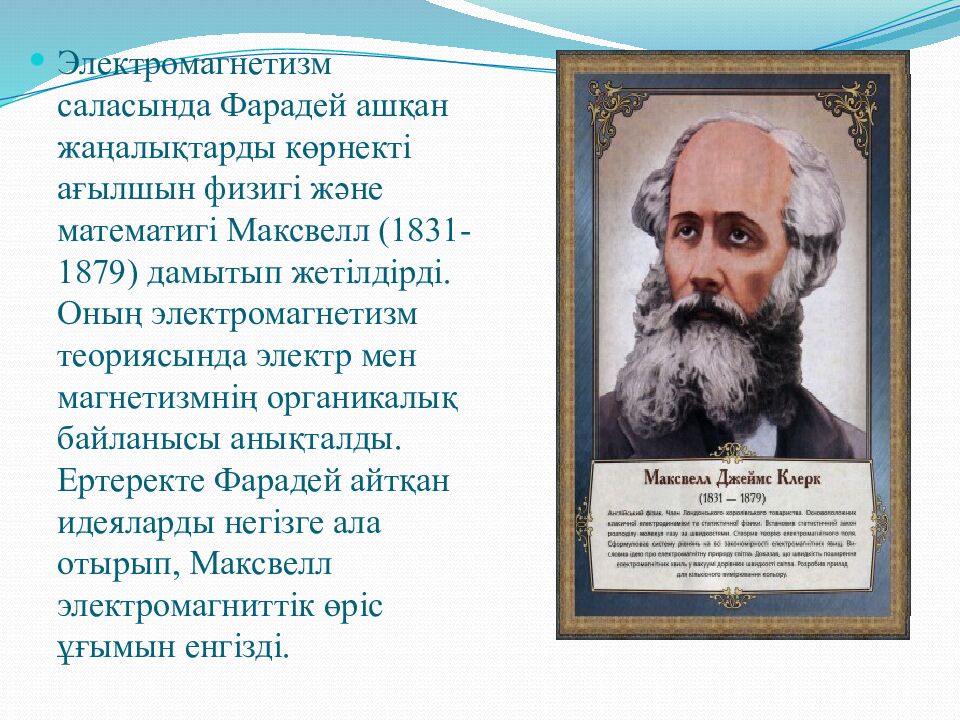 Электромагнетизм саласында Фарадей ашқан жаңалықтарды көрнекті ағылшын физигі және математигі Максвелл (1831-1879) дамытып жетілдірді. Оның электромагнетизм теориясында электр мен магнетизмнің органикалық байланысы анықталды. Ертеректе Фарадей айтқан идеяларды негізге ала отырып, Максвелл электромагниттік өріс ұғымын енгізді.