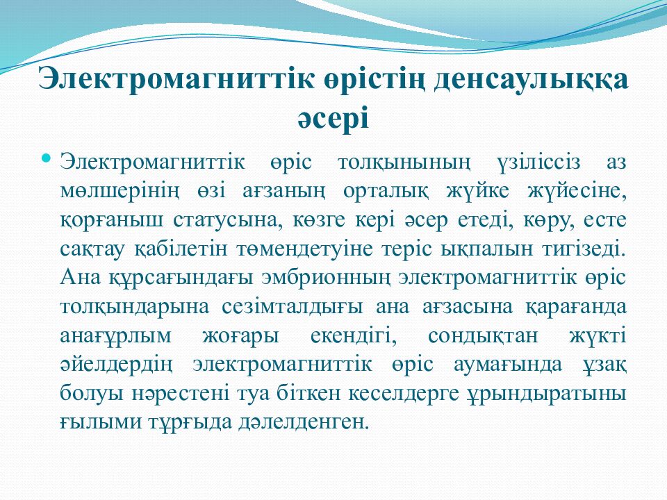 Электромагниттік өріс толқынының үзіліссіз аз мөлшерінің өзі ағзаның орталық жүйке жүйесіне, қорғаныш статусына, көзге кері әсер етеді, көру, есте сақтау қабілетін төмендетуіне теріс ықпалын тигізеді. Ана құрсағындағы эмбрионның электромагниттік өріс толқындарына сезімталдығы ана ағзасына қарағанда анағұрлым жоғары екендігі, сондықтан жүкті әйелдердің электромагниттік өріс аумағында ұзақ болуы нәрестені туа біткен кеселдерге ұрындыратыны ғылыми тұрғыда дәлелденген.