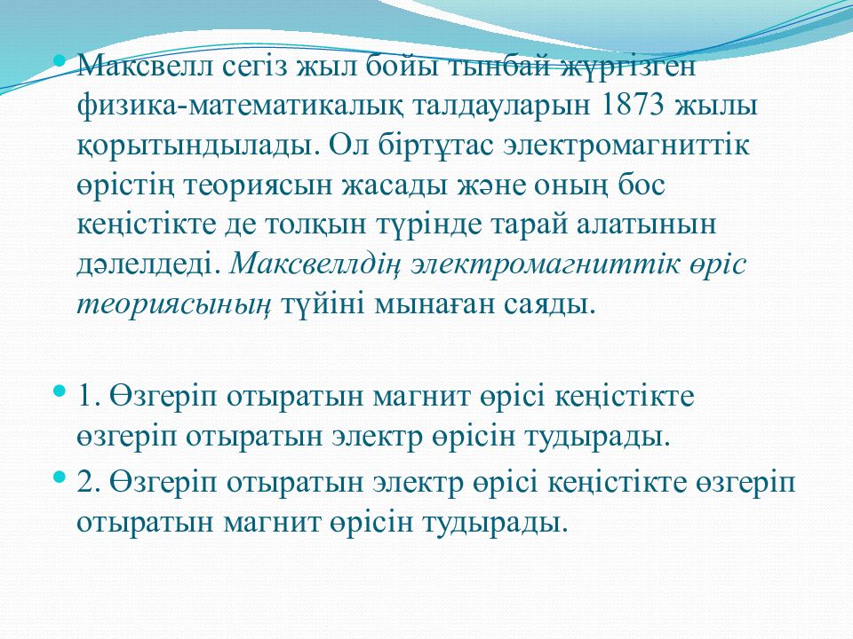 Максвелл сегіз жыл бойы тынбай жүргізген физика- математикалық талдауларын 1873 жылы қорытындылады. Ол біртұтас электромагниттік өрістің теориясын жасады және оның бос кеңістікте де толқын түрінде тарай алатынын дәлелдеді. Максвеллдің электромагниттік өріс теориясының түйіні мынаған саяды. 1. Өзгеріп отыратын магнит өрісі кеңістікте өзгеріп отыратын электр өрісін тудырады. 2. Өзгеріп отыратын электр өрісі кеңістікте өзгеріп отыратын магнит өрісін тудырады.