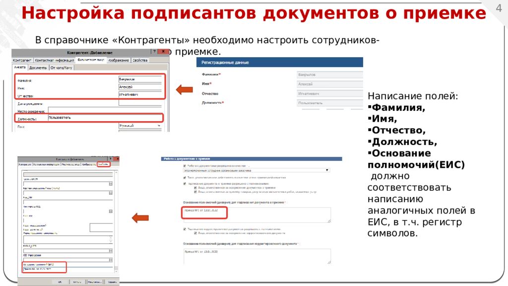 Настройка подписантов документов о приемке В справочнике «Контрагенты» необходимо настроить сотрудников-подписантов документов о приемке. Написание полей: Фамилия, Имя, Отчество, Должность, Основание полномочий(ЕИС) должно соответствовать написанию аналогичных полей в ЕИС, в т.ч. регистр символов.